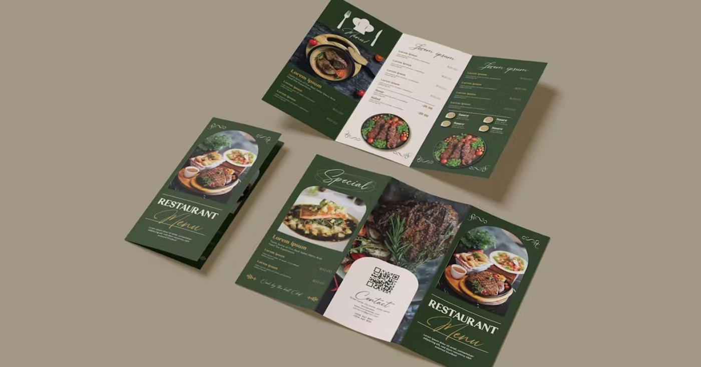 Menu tờ gấp thường có cấu trúc gấp 2 hoặc gấp 3. Phù hợp với quán cafe hoặc quán ăn muốn trình bày nội dung gọn gàng nhưng vẫn đầy đủ. Loại này cân bằng giữa chi phí và tính thẩm mỹ.